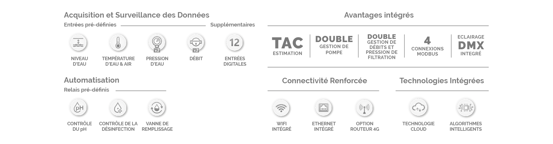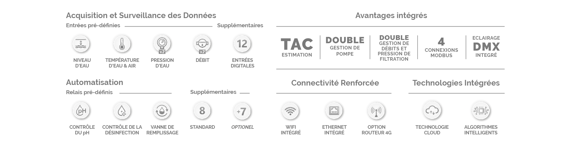 Le système assure une surveillance continue et haute précision via des entrées dédiées à la chimie de l’eau, la température, la pression, le débit et le niveau d’eau. Douze entrées supplémentaires permettent de connecter des capteurs optionnels (état de couverture, niveau de bidon, détection d’inondation, etc.), offrant une vision exhaustive du système, même pour les bassins les plus complexes.