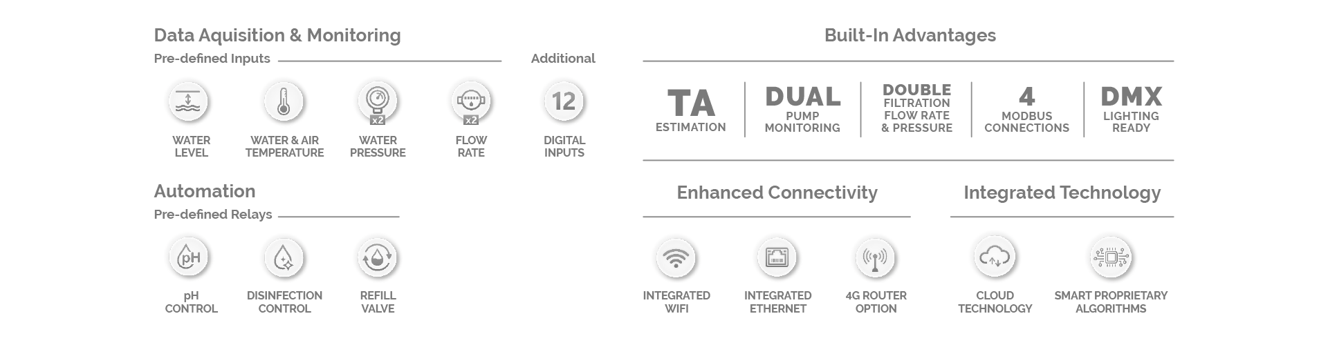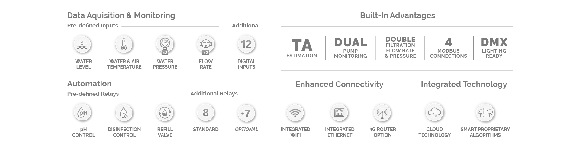The system provides continuous, high‑precision monitoring with dedicated inputs for water chemistry, temperature, pressure, flow rate and water level. Twelve additional inputs support optional sensors for cover status, drum level, flood detection and other data points—delivering complete system awareness for pools of any complexity.